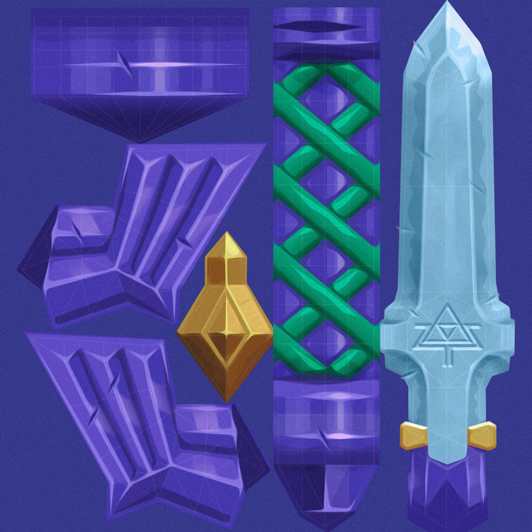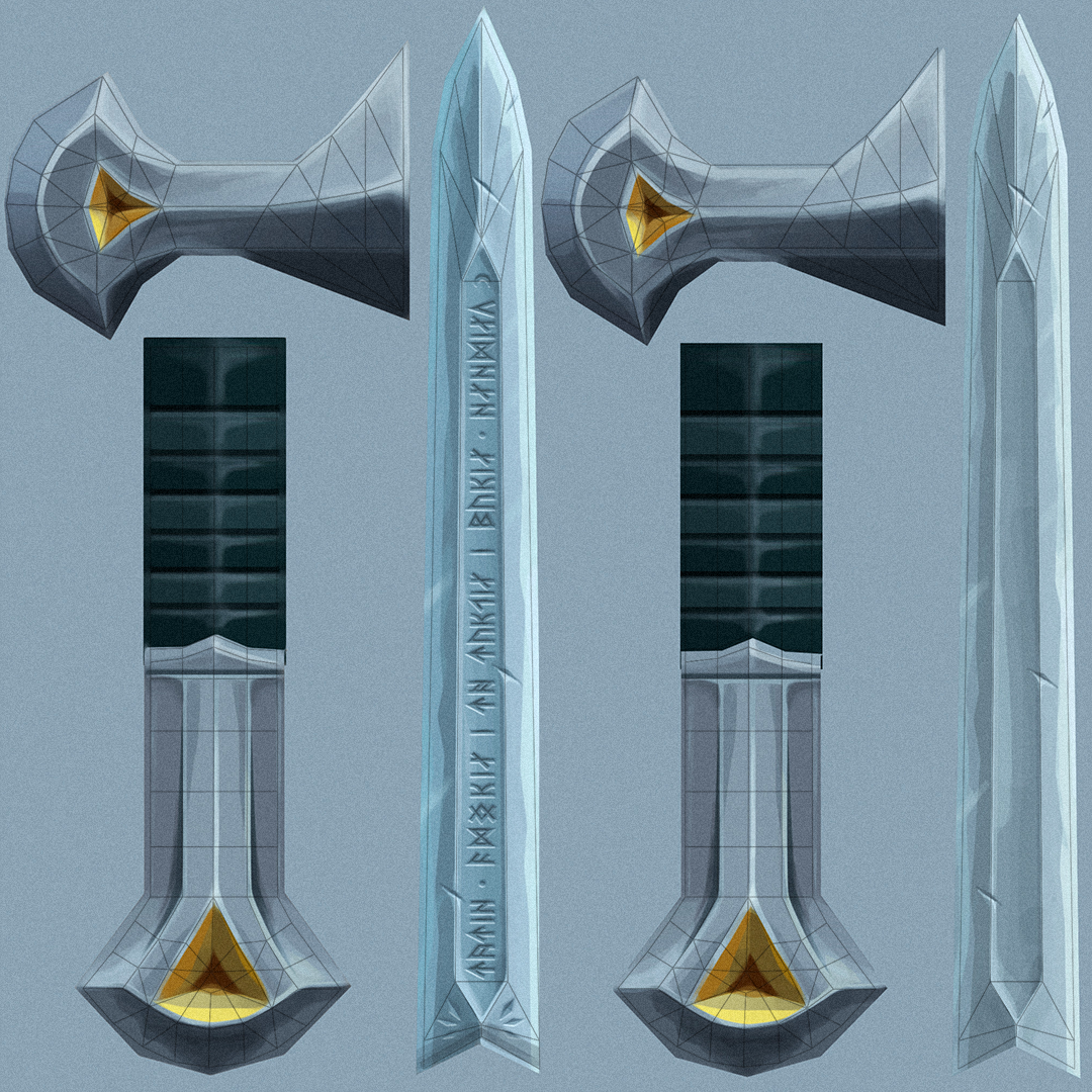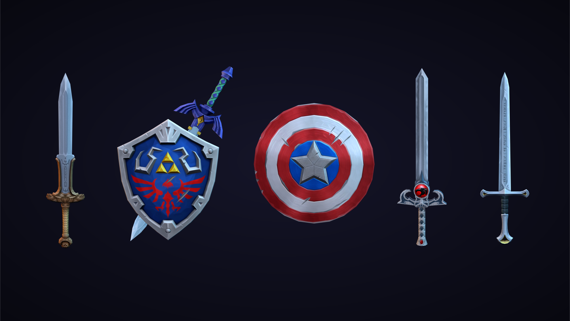 Concept art for some famous pop culture weapons in the style of Blizzard's Warcraft